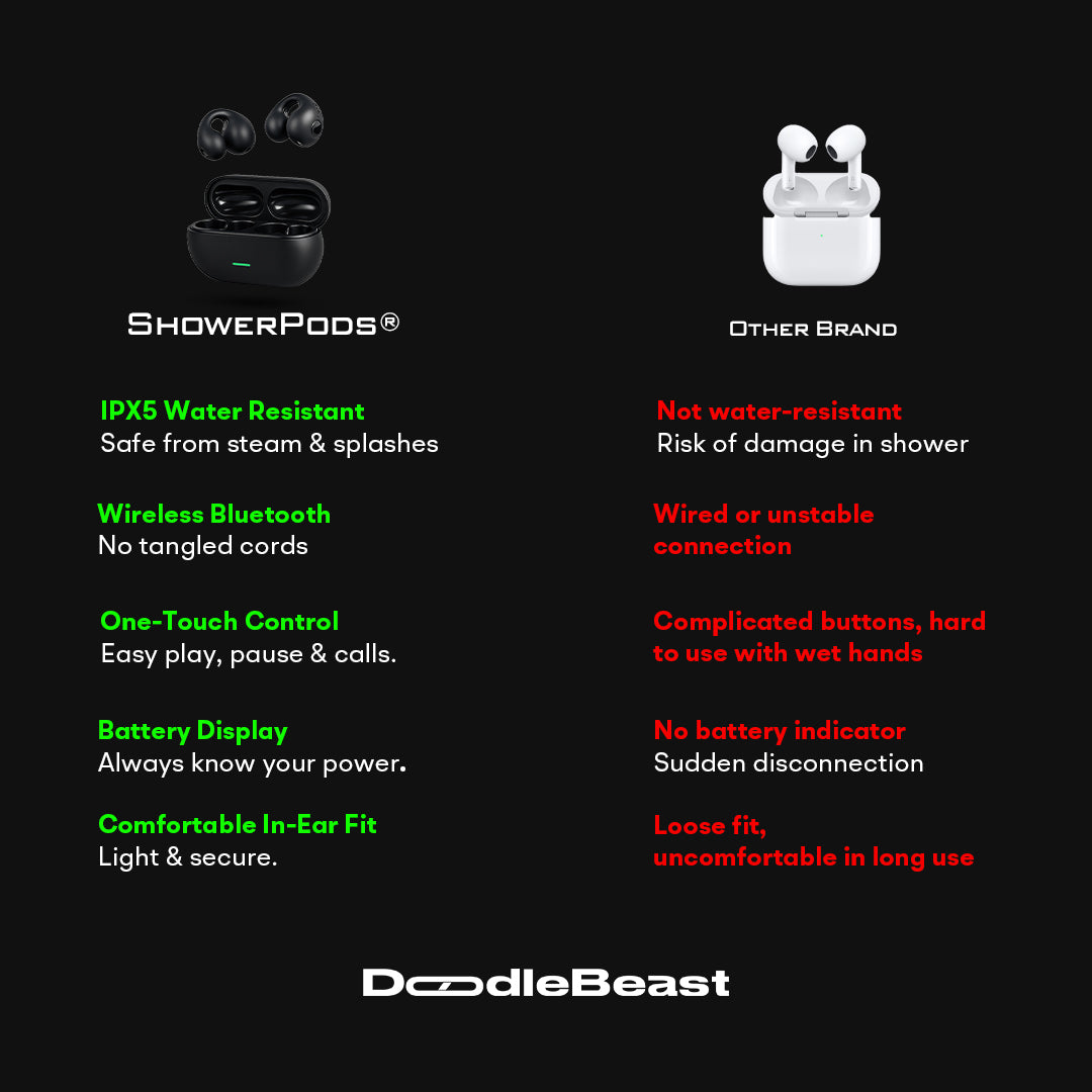 ShowerPods® waterproof earbuds transform listening in wet spaces. With an advanced splash-shield (IPX5), secure lock-in tips, and physical button controls, they target the root causes of shower-time frustration—spray, steam, and accidental taps—delivering immediate and sustained clarity. Ideal for daily showers, post-workout rinses, and steamy bathrooms, they promise optimal comfort, control, and sound.